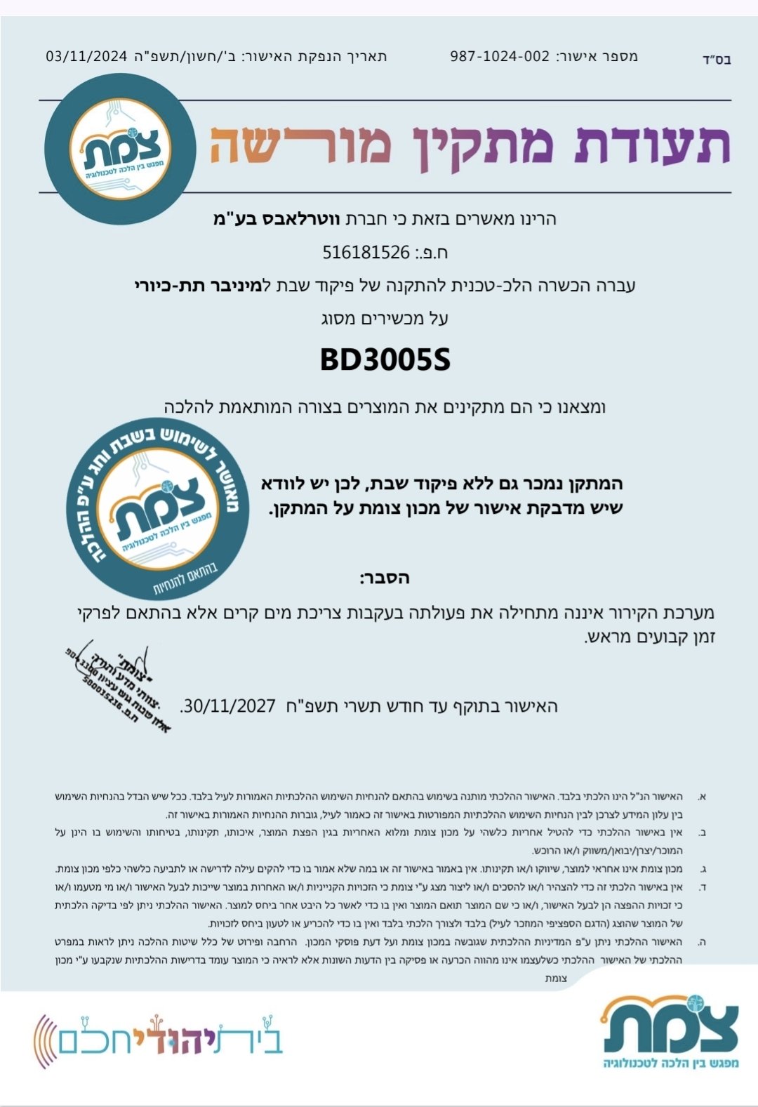דגם המוצר נבדק ואושר ע״ מכון התקנים כמתאים לתקן רשמי 900 חלק 1